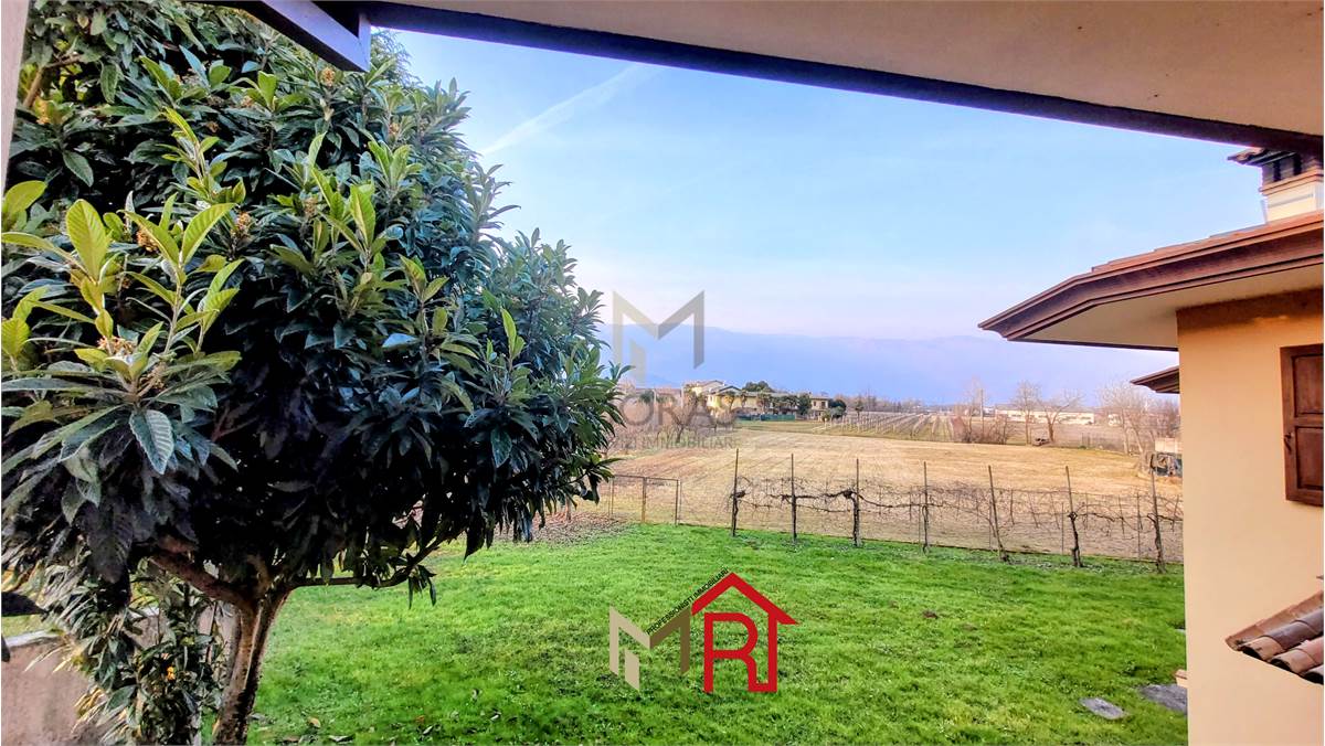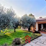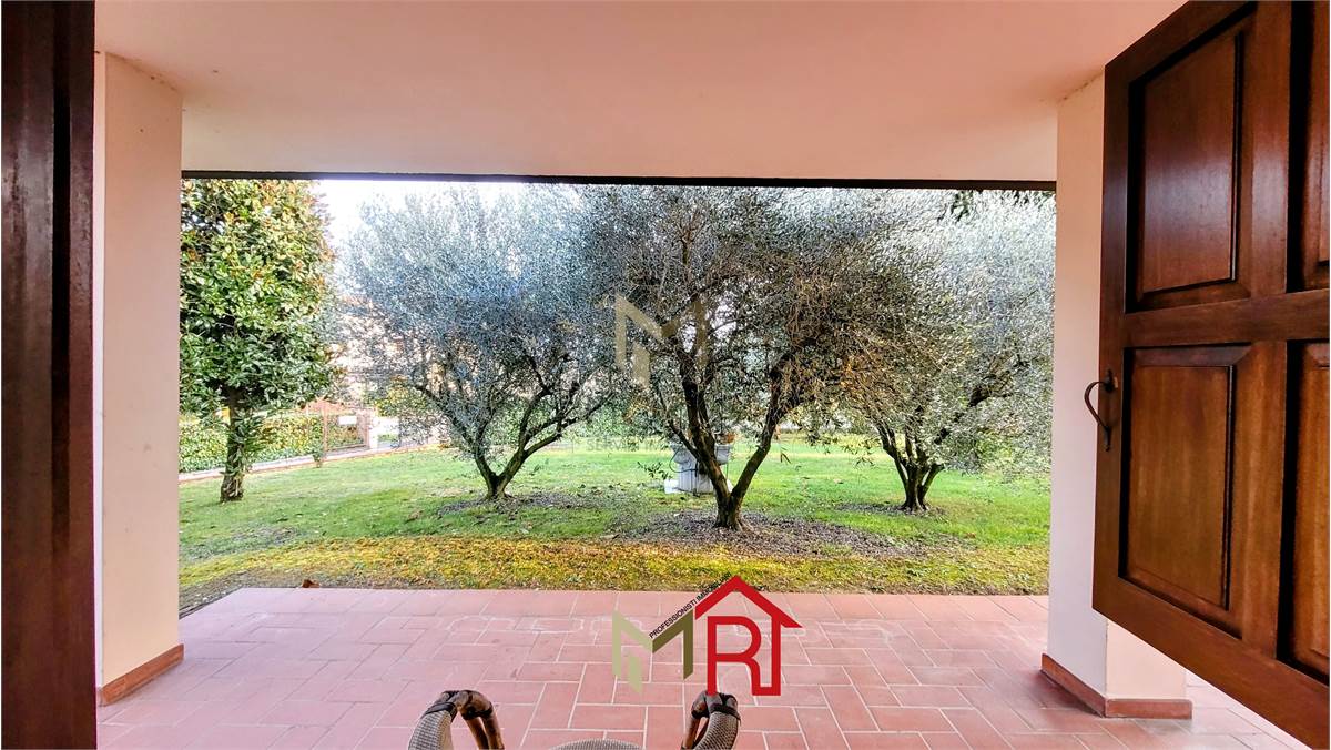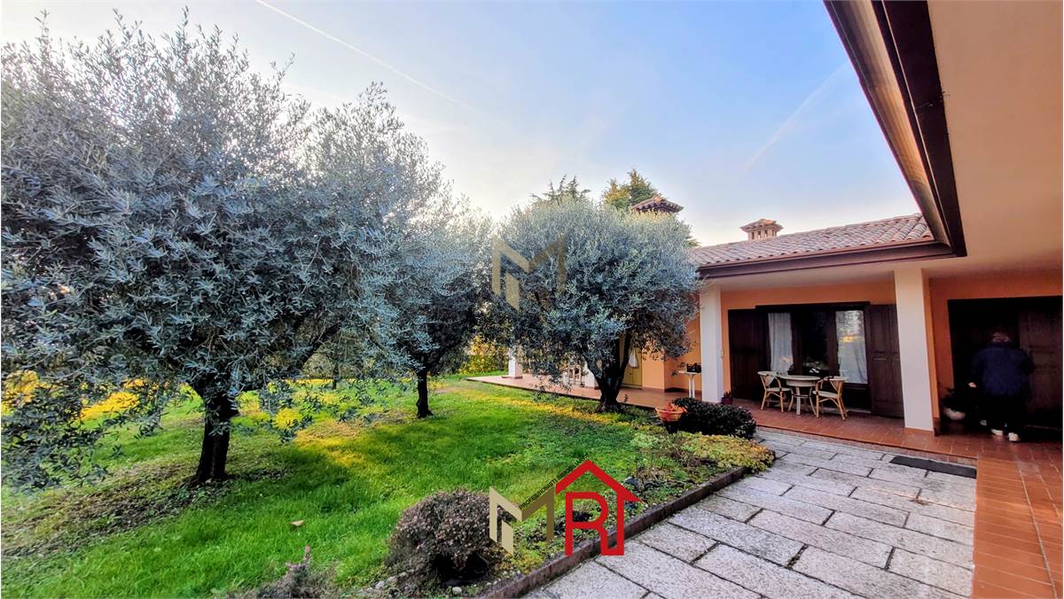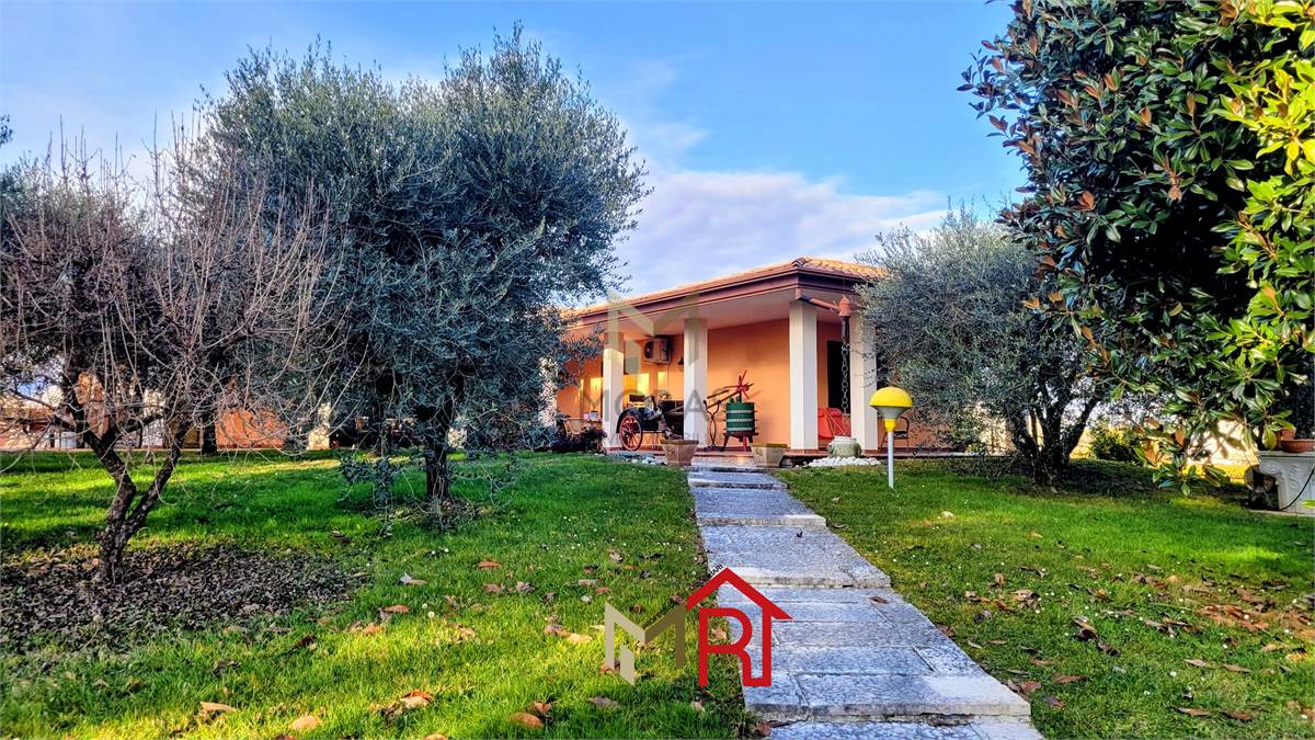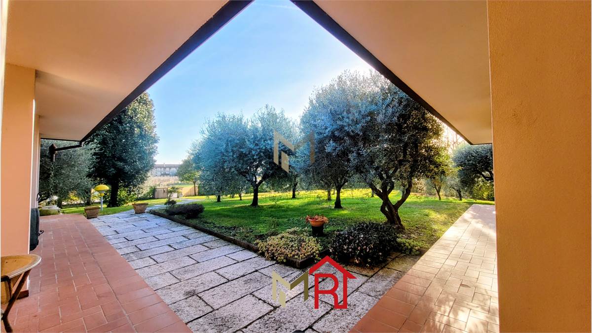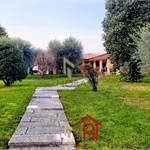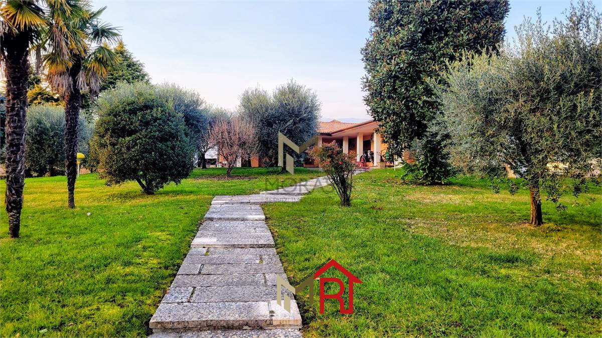 Esterni: La villa è immersa in un vasto giardino ben piantumato con un vialetto in pietra che conduce all'ingresso, offrendo massima privacy e ampi spazi per il tempo libero all'aperto.